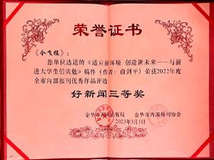 今飛報(bao)-選送的《適應新(xin)(xin)(xin)(xin)環境 創(chuang)造新(xin)(xin)(xin)(xin)未(wei)來——與(yu)新(xin)(xin)(xin)(xin)近大學(xue)生們(men)共勉》稿件(作者(zhe):俞劍平)榮獲2022年度(du)全市內部報(bao)刊優(you)秀作品評選好(hao)新(xin)(xin)(xin)(xin)聞三等(deng)獎