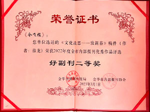 今(jin)飛報(bao)-選送的《文(wen)化(hua)淺思——致新(xin)春(chun)》稿件(jian)(作者:徐龍(long))榮(rong)獲2022年度全市內部(bu)報(bao)刊(kan)優秀作品評選好新(xin)聞三等(deng)獎