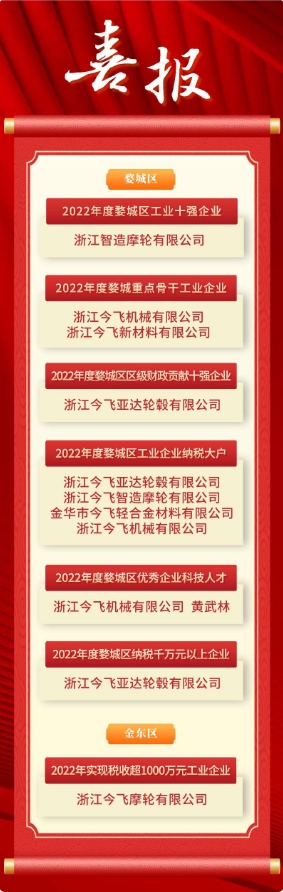 今(jin)飛(fei)控股(gu)集團(tuan)有(you)限公(gong)司(si)始建于(yu)1959年(nian),公(gong)司(si)總部(bu)位于(yu)金(jin)華市開發區,于(yu)2000年(nian)開始被列入(ru)金(jin)華市政(zheng)府重(zhong)點扶持優勢企(qi)業(ye)(ye),相繼被評為中國(guo)汽車零部(bu)件百強企(qi)業(ye)(ye)、中國(guo)摩(mo)托車行業(ye)(ye)零部(bu)件優勢企(qi)業(ye)(ye)、中國(guo)汽車零部(bu)件車輪行業(ye)(ye)龍頭(tou)企(qi)業(ye)(ye)、全國(guo)就業(ye)(ye)與社(she)會保障先進民營企(qi)業(ye)(ye)、浙江省工業(ye)(ye)行業(ye)(ye)龍頭(tou)骨干企(qi)業(ye)(ye)...