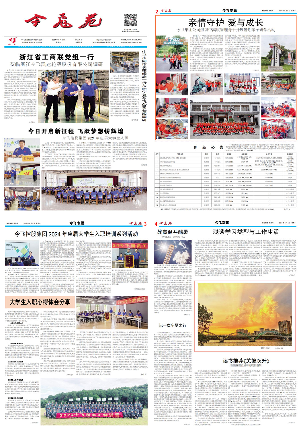 浙江省工商聯黨組一行蒞臨浙江今(jin)飛凱達(da)輪轂股份有(you)限公司調研(yan)今日(ri)開啟新征程,飛(fei)躍(yue)夢想鑄輝(hui)煌——今飛(fei)控股集團(tuan)2024年應屆大(da)學生入職中衛市副市長康俊杰(jie)一行蒞臨(lin)寧夏今飛(fei)參(can)觀調研(yan)親(qin)情守護(hu) 愛(ai)與成長丨今飛集團(tuan)公司組織(zhi)中高層管理骨(gu)干開展(zhan)暑(shu)期親(qin)子研學活動創 新 公 告今日開啟新征程,飛躍夢想鑄輝煌——今飛控股集團2024年應屆大學(xue)生入職培訓(xun)系(xi)列活動(dong)入職培(pei)訓拓展心得心得體(ti)會讀書推薦《關鍵(jian)躍升》新任管理者成事的底層(ceng)邏輯戰(zhan)高溫,斗酷(ku)暑——致敬最(zui)可(ke)愛的今飛人記(ji)一次寧夏之行淺談學習(xi)類型與工作生活今飛控股集團新人培訓(xun)心(xin)得體會