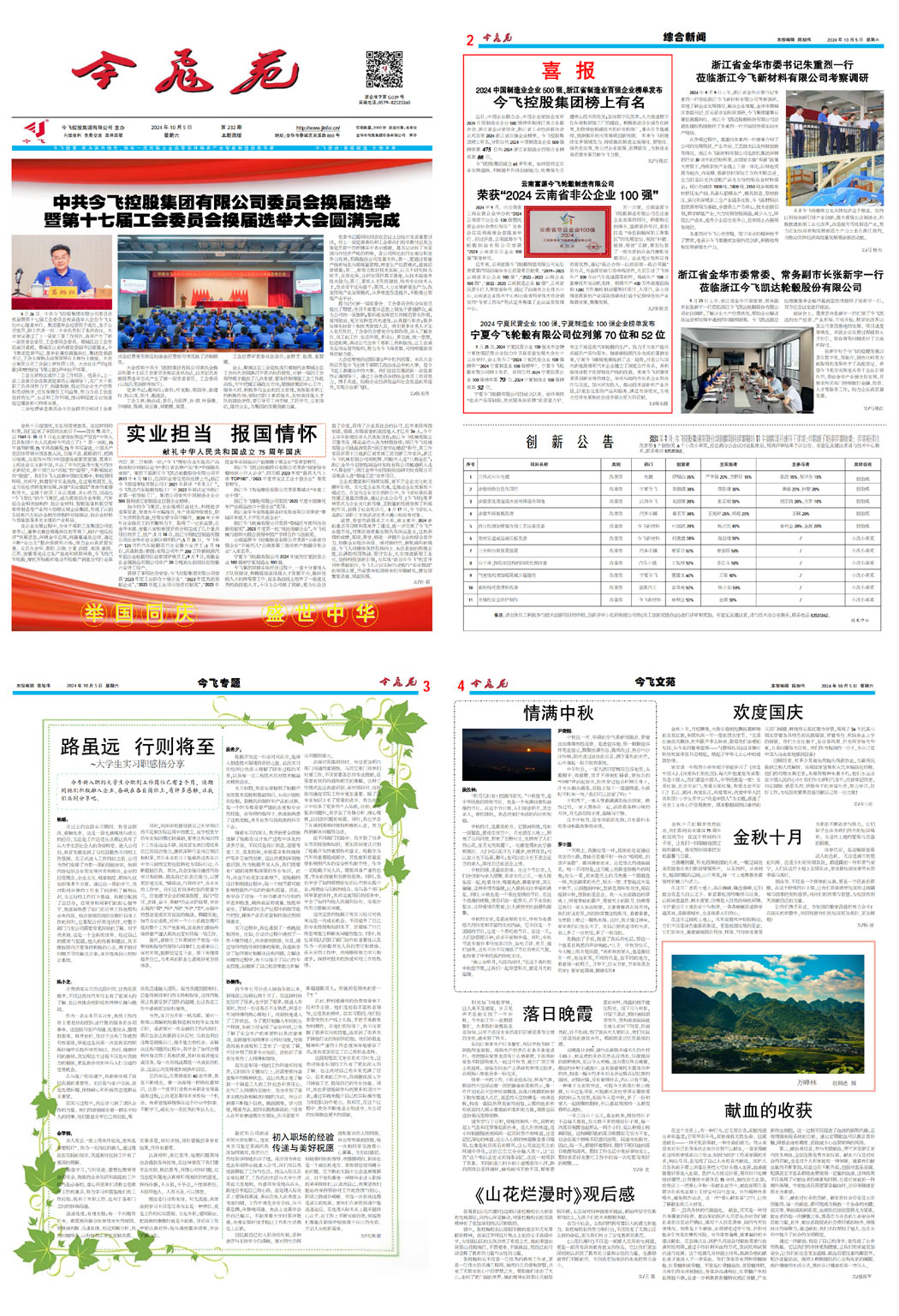 中共(gong)今(jin)飛控股(gu)集團有限(xian)公(gong)司委員會(hui)換(huan)(huan)屆暨(ji)第十七屆工(gong)會(hui)委員會(hui)換(huan)(huan)屆選舉大會(hui)圓滿完成實業(ye)擔當 報國情懷(huai)——獻(xian)禮中華(hua)人民共和國成立75周年國慶喜報丨2024中國制造(zao)業(ye)企業(ye)500強、浙江省制造(zao)業(ye)百強企業(ye)榜單發布,今飛控股(gu)集團榜上有名!浙江省金華市委書記朱重烈一(yi)行蒞臨浙江今飛新材(cai)料(liao)有限公司考察(cha)調研云南富(fu)源今(jin)飛輪轂制造有(you)限(xian)公司榮獲“2024云南省非(fei)公企(qi)業100強”浙江(jiang)省金華市委常委、常務副市長(chang)張新宇一(yi)行蒞臨浙江(jiang)今飛凱達輪轂(gu)股份有限公司走訪調研2024寧(ning)夏民(min)營企(qi)業100強、寧(ning)夏制造業100強企(qi)業榜單(dan)發布,寧(ning)夏今飛輪轂有(you)限公司(si)位列第70位和52位創(chuang) 新 公 告(gao)初入職(zhi)場的經驗傳遞與美好祝愿營銷部實習(xi)工(gong)作感悟(wu)工作感悟實(shi)習(xi)感悟路雖遠(yuan) 行則(ze)將至實習心得感(gan)悟情滿中(zhong)秋歡度國慶金秋十月(yue)落日晚(wan)霞獻血的收(shou)獲《山(shan)花爛漫時(shi)》觀后感