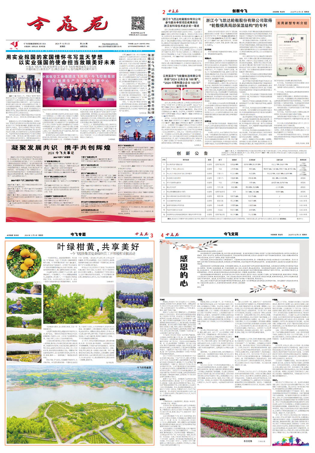 用(yong)實業報國的(de)家國情(qing)懷書寫(xie)藍天夢想 以實業強國的(de)使(shi)命(ming)擔當放眼美好(hao)未來——中航(hang)沈飛民用(yong)飛機有(you)限(xian)責(ze)任公(gong)司(si)與今飛控股集團有(you)限(xian)公(gong)司(si)合(he)作共建(jian)的(de)航(hang)空(新質生產力)聯合(he)創(chuang)新中心簽約(yue)揭牌儀(yi)式順利(li)舉行凝(ning)聚發展共(gong)識 攜手共(gong)創輝煌——2024今飛(fei)大事記浙(zhe)江今(jin)飛凱(kai)達輪轂股份(fen)有限公司(si)(si)總經理(li)張建權受邀參(can)加2024浙(zhe)江省上市公司(si)(si)高峰論壇喜報丨浙(zhe)江(jiang)今飛凱達輪轂股份有限公司參與聯合申報項目成果(guo)榮獲浙(zhe)江(jiang)省科學(xue)技術進步獎一等(deng)獎云南(nan)富源(yuan)今飛輪轂制(zhi)造有限(xian)公司(si)榮(rong)獲“2024云南(nan)企(qi)業100強”、“2024云南(nan)制(zhi)造業企(qi)業100強”榮(rong)譽稱號浙江(jiang)今飛凱達輪(lun)轂股(gu)份有限公司取得“輪(lun)轂模(mo)具局部保(bao)溫結構(gou)”的專利創 新 公(gong) 告葉(xie)綠柑黃,共享美(mei)好——今飛控(kong)股集團黨(dang)委(wei)組織員工開(kai)展椪柑采摘(zhai)活動(dong)橙黃(huang)橘紅(hong)感恩的(de)心