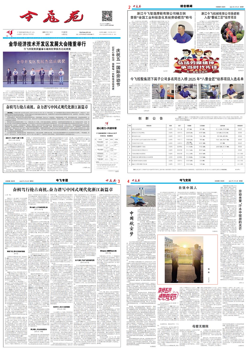 金華經濟技術開(kai)發(fa)區(qu)發(fa)展大會隆重舉行,今飛控股集團董事長葛(ge)炳灶榮獲杰出成(cheng)就(jiu)獎慶祝五(wu)一(yi)國際(ji)勞動節(jie)丨以匠心鑄(zhu)山(shan)河(he),致敬每一(yi)位(wei)制造業(ye)追光者凝心聚(ju)力 ? 共(gong)譜華章丨今飛控股(gu)集團第十六屆企業文化節即(ji)將(jiang)啟動(dong)敬請(qing)期待奮(fen)(fen)楫篤行搶占商機,奮(fen)(fen)力譜寫(xie)中國式現代化浙江新篇(pian)章奮楫篤(du)行(xing)搶(qiang)占商機,奮力譜寫(xie)中(zhong)國式現(xian)代(dai)化浙江新篇章(zhang)喜報丨浙江今飛(fei)智(zhi)造摩輪有限公司楊志鋼榮獲“全國工業和信(xin)息(xi)化(hua)系統勞動模范”稱(cheng)號(hao)喜報(bao)|浙江今飛(fei)機械有限公司徐建明入選“婺(wu)城工(gong)匠”培育項(xiang)目喜報丨今飛控股集團下屬子公司多名(ming)同(tong)志入榜2025年(nian)“八婺金匠”培養項目入選名(ming)單創 新 公 告(gao)自(zi)強中國(guo)人勞動光(guang)榮,汗水(shui)中(zhong)綻(zhan)放(fang)的光(guang)芒母愛無期(qi)限(xian)濃情五月(yue)感恩(en)母(mu)親(qin)節(jie)中國航(hang)空夢